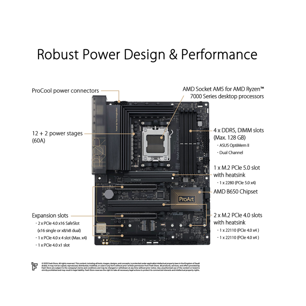 • سواء كنت محرر فيديو، مصمم جرافيك، أو لاعب يبحث عن استقرار عالٍ وأداء قوي، فإن ASUS PROART B650-CREATOR توفر التوازن المثالي بين الأداء والابتكار.