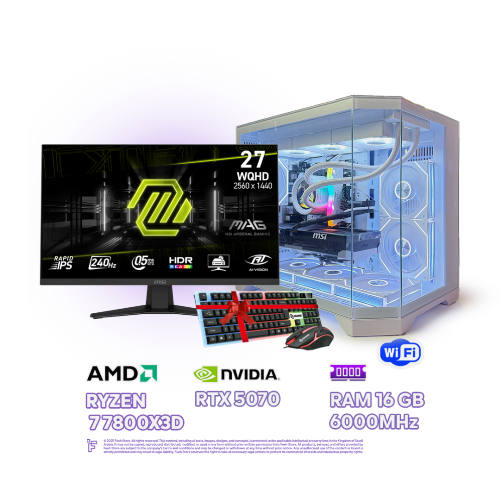 All components are housed in a stylish Feeh F30 ARGB case with professional lighting and a luxurious design, complete with an MSI MAG 274QF X24 monitor with a 2K QHD resolution and 180Hz refresh rate for a smooth and responsive viewing experience.